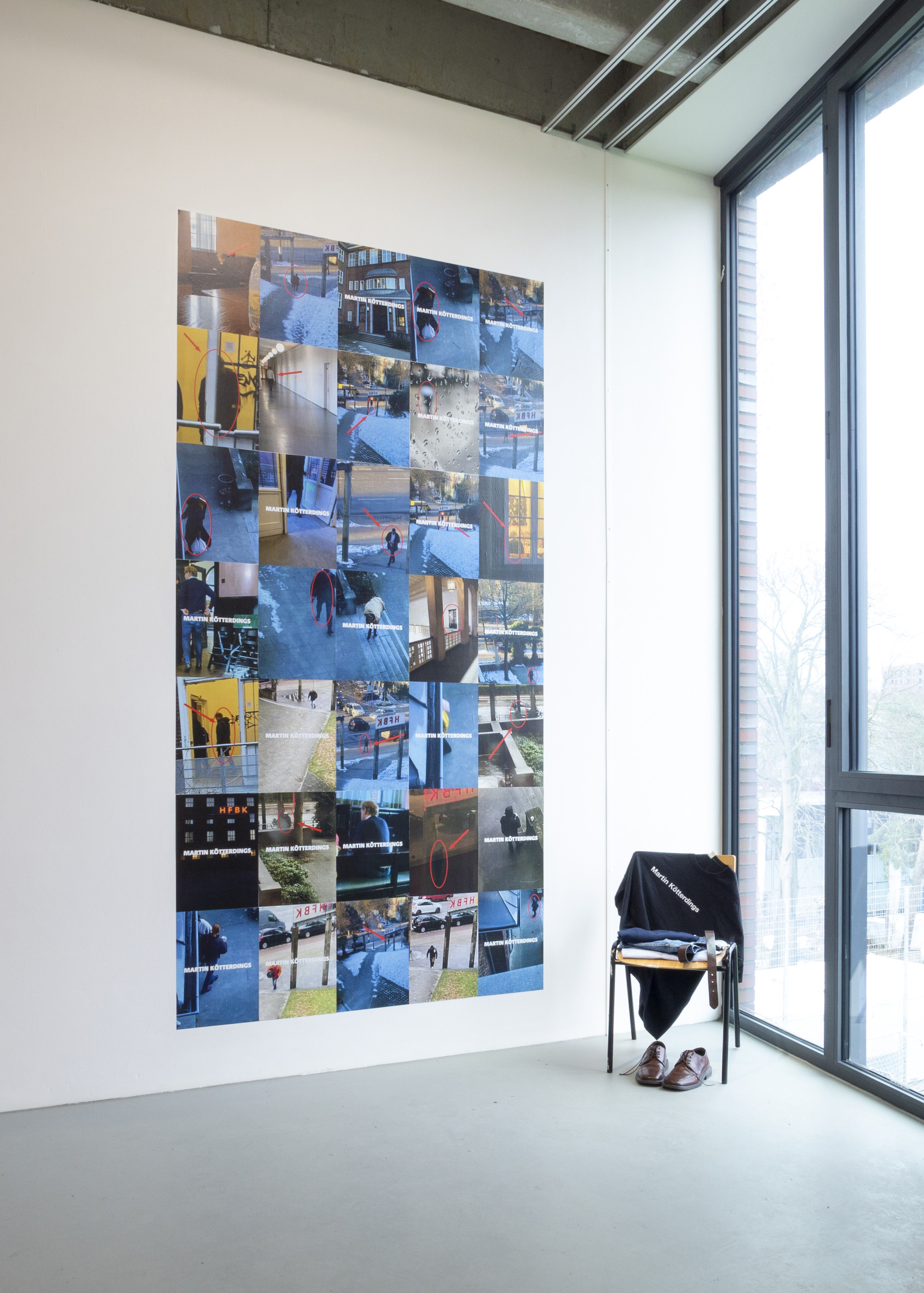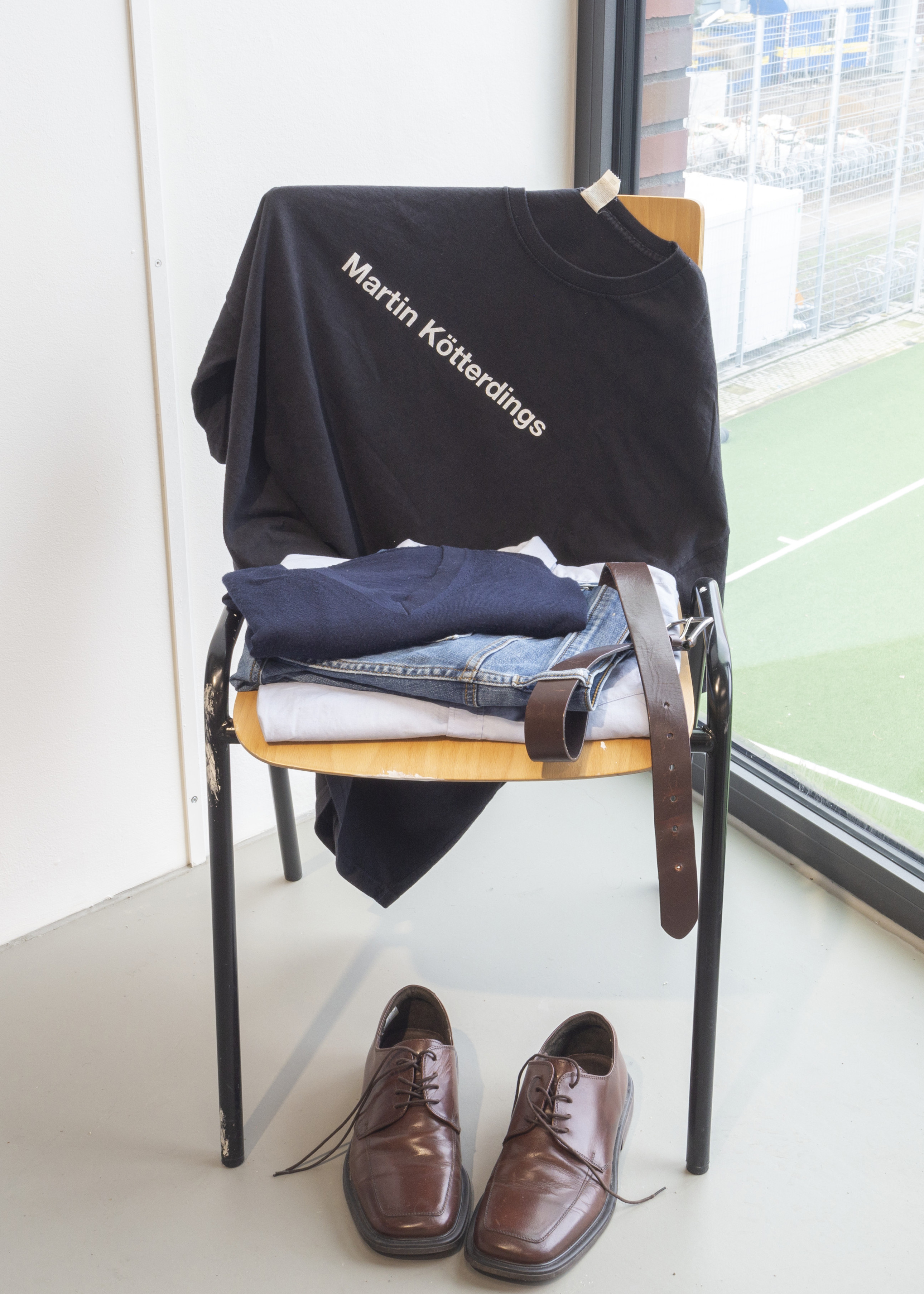 Eine Installation, deren Objekt der Präsident der HFBK, Martin Köttering, ist. Ein Shirt mit einer Verballhornung seines Namens, arrangiert auf einem Kleiderberg, der seiner sein könnte. An der Wand dahinter ein fotografisches Editorial: Auf der Suche nach der Machtfigur der Kunsthochschule.
